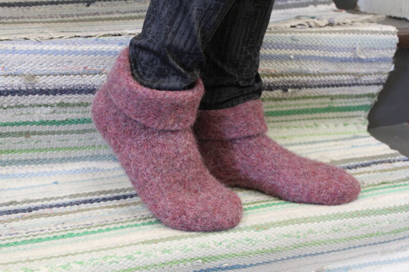 Vanutus: Vanutus tapahtuu pesukoneessa 40° (tai 60° riippuen pesukoneesta), linkous 1200 kierrosta/min. Lisää pyykinpesuainetta ja esim. farkut koneeseen. Huovutuksen jälkeen tossut kannattaa heti muotoilla laittamalla ne jalkaan. Kosteina tossuja pystyy venyttämään reilusti tarvittaessa. Jos tossut eivät ole tarpeeksi napakat, voit vielä huovuttaa käsin esim. Mäntysuopa- tai Marseille-saippuavedellä.