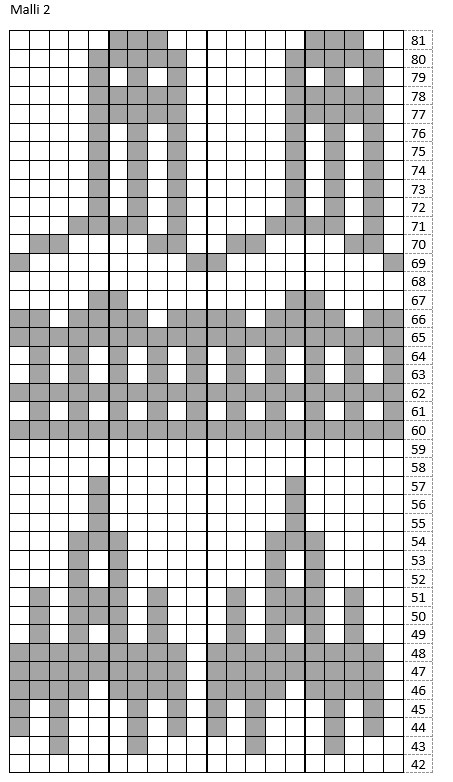 Luo 140 silmukkaa päävärillä. Neulo pyörönä n. 10 cm päävärillä sileää neuletta. Neulo yksi kerros nurin. Neulo 8 kerrosta oikein. Lisää työhön kuviolanka ja aloita kirjoneulekaavio. Neulo ensin malli 1, sitten malli 2. Neulottuasi kummatkin kirjoneulemallit, neulo vielä 7 kerrosta sileää ja yksi nurja kerros. Jatka vuorin neulomista. Mittaa nurjien kerrosten välinen kirjoneulealue. Neulo vuoria päävärillä, kunnes nurjien kerrosten ulkopuoliset alueet ovat yhteensä yhtä pitkät kuin kirjoneuleosuus. Jos pääväri loppuu kesken, voi jatkaa vuorin loppuun kuviovärillä. Päättele silmukat ja työssä olevat langat. Lopuksi ompele käsin huivin reunat yhteen niin, että muodostuu kaksinkertainen tuubihuivi. Viimeistele neuletyösi kastelemalla tai höyryttämällä se. Kuivaa työ tasona.