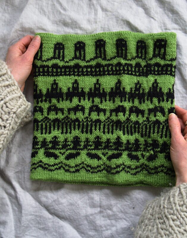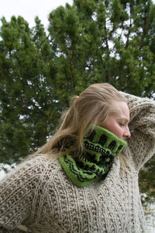 Tarvikkeet: n. 100g Pirtin Kehräämön Villanka kampalankaa 90×3 värinro 319 musta ja n. 100g värinro 20 omenanvihreä